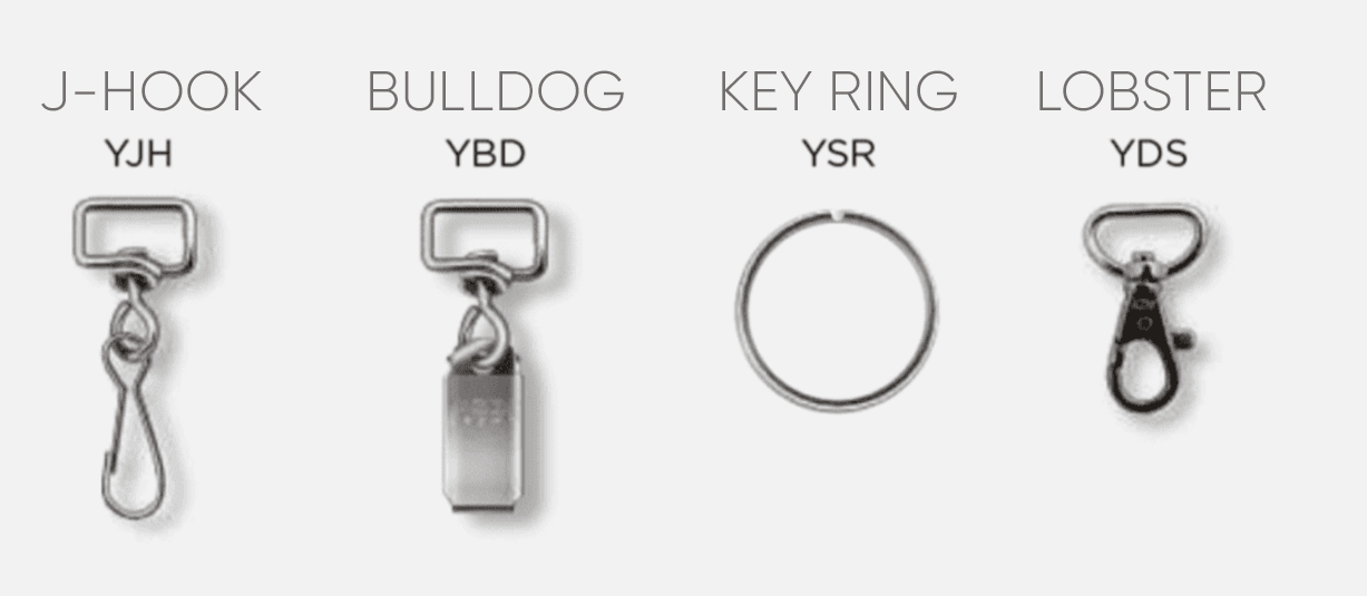 Lanyards are usually woven fabric and imprinted with a logo or branding. They have a small metal ring or clip at the bottom to hold your credentials. Various clips are available, including: